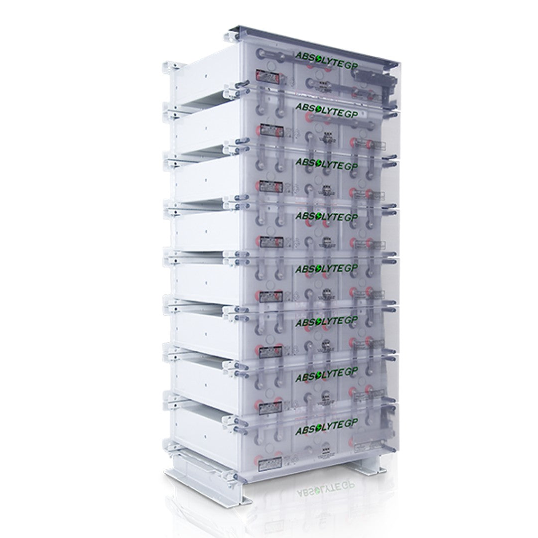 The Absolyte GP is an absorbent glass mat (AGM) design equipped with a lead calcium-tin positive grid alloy, which provides superior float life (20 years at 25ºC) and cycling capabilities (1200 cycles to 80% depth of discharge). Absolyte GP cells are housed in modular steel trays which provide a compact footprint and easy installation.